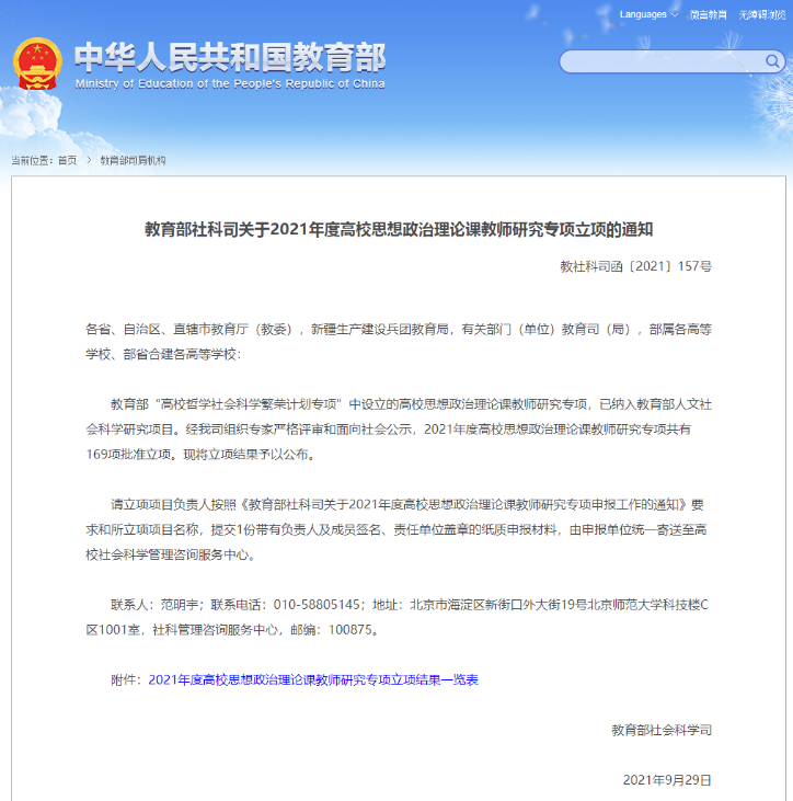 近日,2021年度教育部高校思想政治理论课教师研究专项立项结果公布,经教育部社科司组织专家严格评审和面向社会公示,我校马克思主义学院杨盈老师主持的课题“新时代劳动教育融入高职院校思政课实践教学路径研究”获批立项。