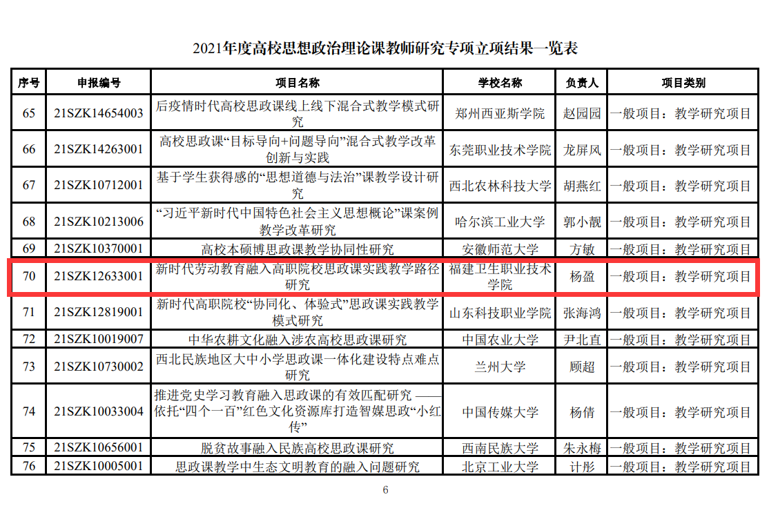 教育部高校思想政治理论课教师研究专项是“高校哲学社会科学繁荣计划专项”的重要内容,纳入教育部人文社会科学研究项目。2021年度高校思想政治理论课教师研究专项共立项169项课题,全国高职院校入选项目仅37项,我校为福建省高职院校唯一获批立项单位。