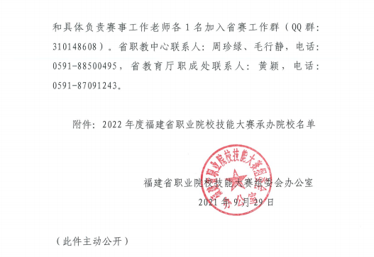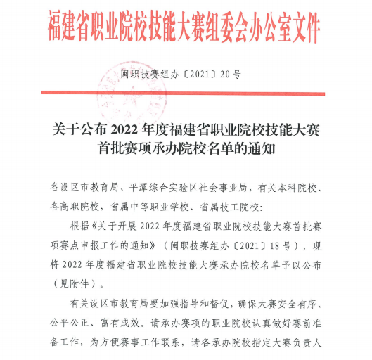 根据《关于公布2022年度福建省职业院校技能大赛首批赛项承办院校名单的通知》(闽职技赛组办〔2021〕20号),我校获批2022年度福建省职业院校技能大赛首批三个赛项承办院校。