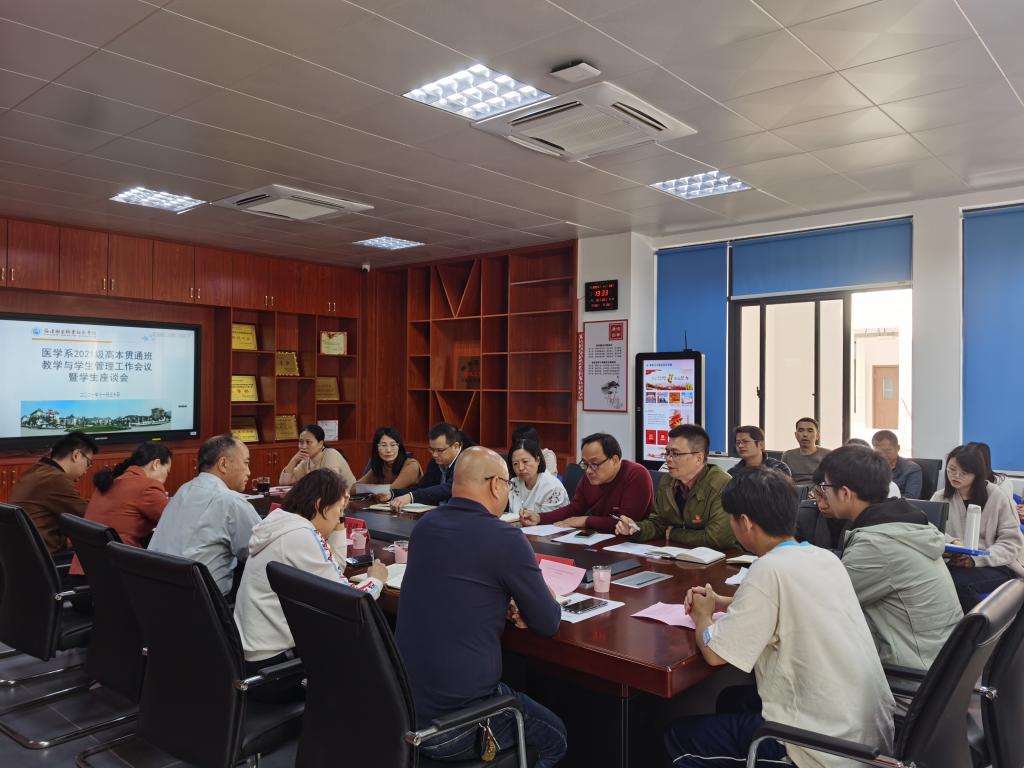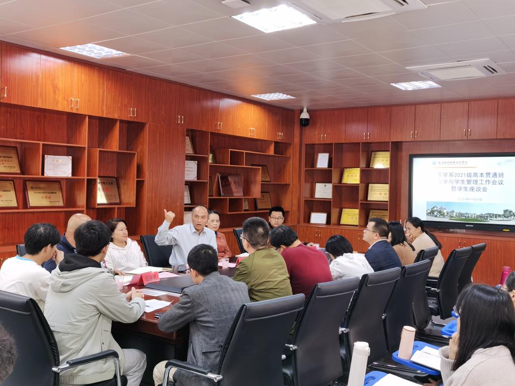 2021年11月30日,医学系开展2021级高本贯通班教学与学生管理工作会议暨学生座谈会,校长许能锋、副校长郑翠红,教务处、学生工作部负责人,党政办公室相关人员、医学系党政负责人、辅导员、医学系及医学基础部12位班导师、学生代表参加座谈会。