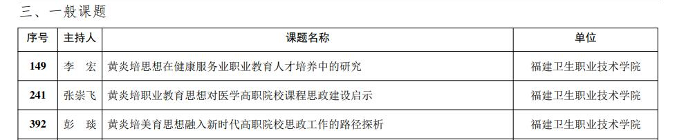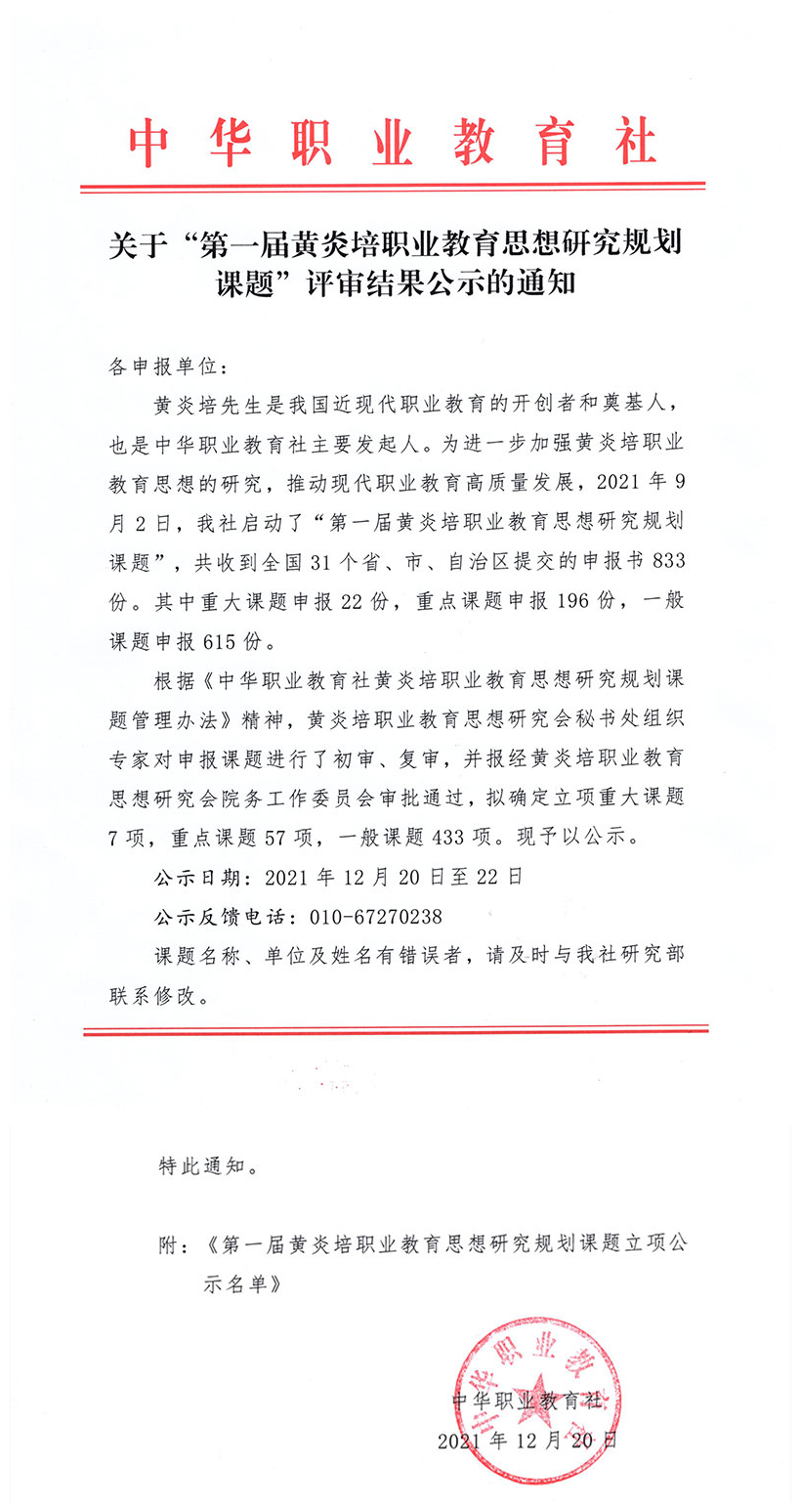根据中华职业教育社《关于“第一届黄炎培职业教育思想研究规划课题”评审结果公示的通知》,我校三项课题获一般课题立项。