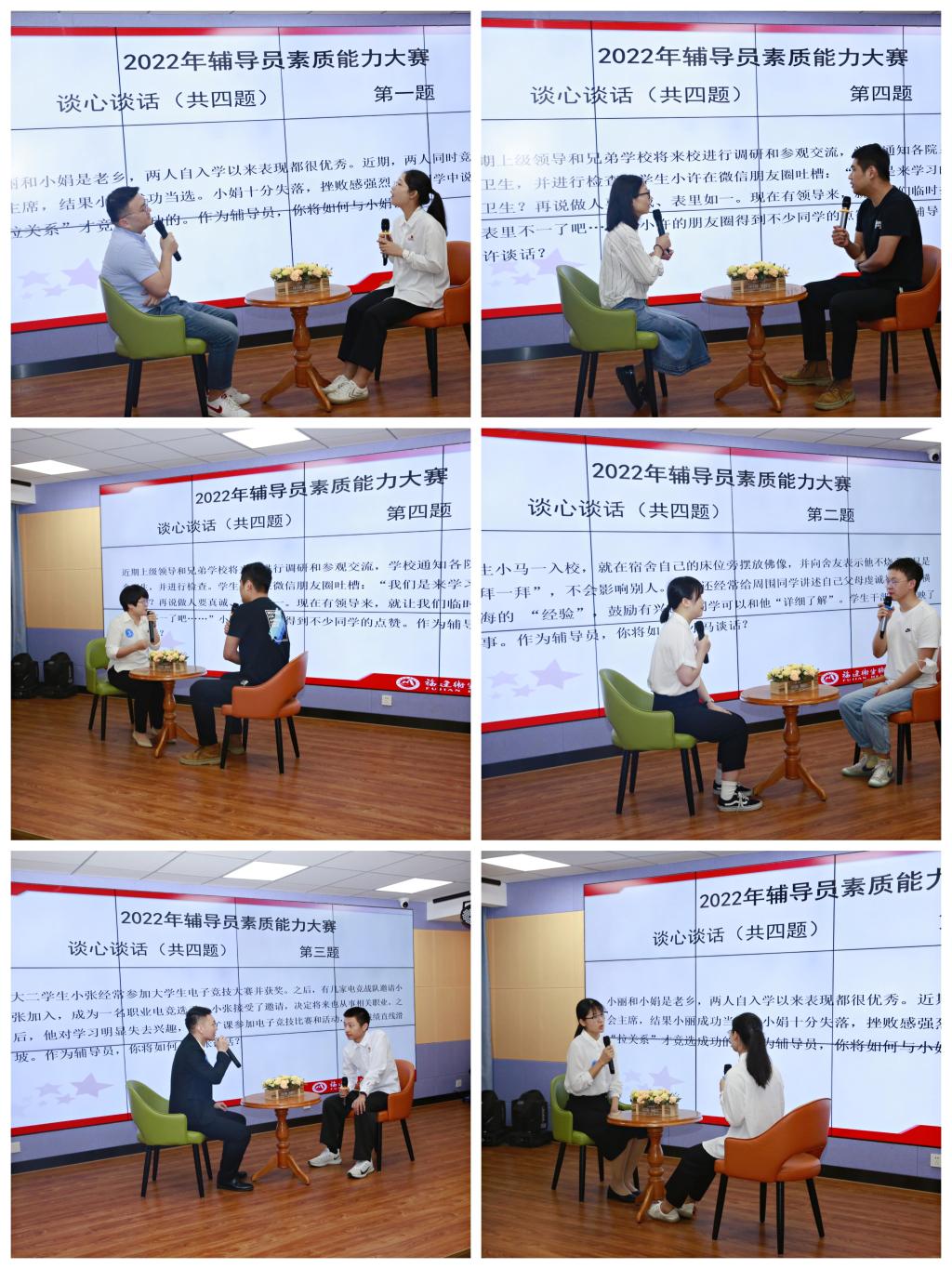 本次决赛参照全省辅导员素质能力大赛最新赛制举行,分为案例研讨、谈心谈话两个环节。