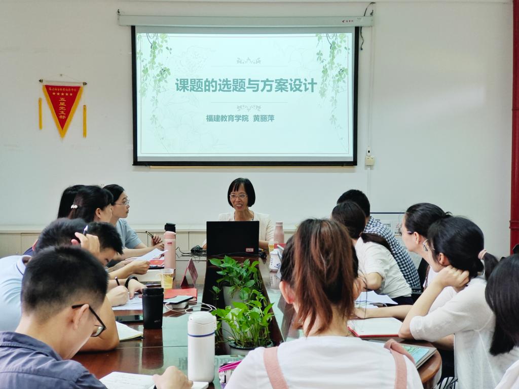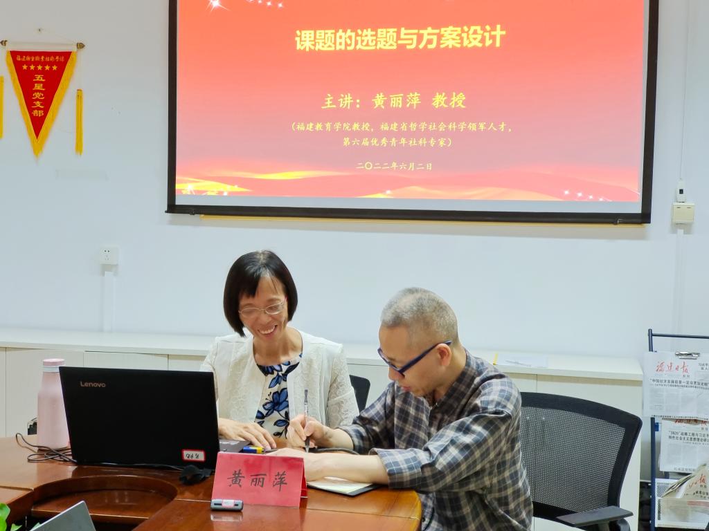 为全面提升我校思政课教师科研项目申报质量,有效推进课题研究工作,促进教师专业化成长。2022年6月2日,我校马克思主义学院邀请福建省哲学社会科学领军人才、福建教育学院黄丽萍教授为全体专兼职思政课教师作《课题的选题与方案设计》专题讲座。讲座由马克思主义学院副院长来朋珍主持。