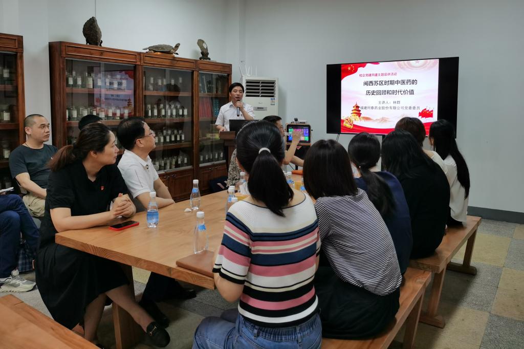 活动伊始,福建同春药业股份有限公司党委委员、福州同春中药有限公司董事长林群以《闽西苏区时期中医药的历史回顾和时代价值》为主题给全体党员上了一堂精彩的党课。林群详细讲述了中医药在中央苏区(福建)所发挥出的重要作用与力量,以及军队在缺医少药、卫生条件落后的状况下,依靠群众,不畏困难,开拓医药卫生事业的奋斗历程。此次党课使党员们对中医药文化有了更深的认识,并激励大家凝心聚力推动中医药事业传承创新发展。