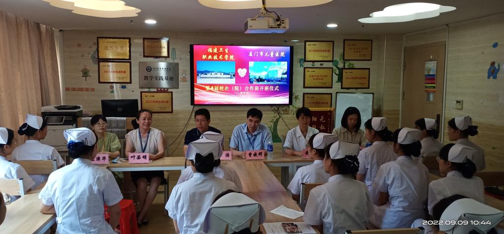 9月9日,护理学院与厦门市儿童医院联合开办的2021级护理专业校院合作班在厦门市儿童医院正式开班,厦门市儿童医院副院长曾晓辉、办公室主任(护理教研室主任)黄湘晖、护理部副主任叶茹明,我校护理学院副院长林浩,双方有关老师、辅导员、班主任以及23名学生参加开班仪式。