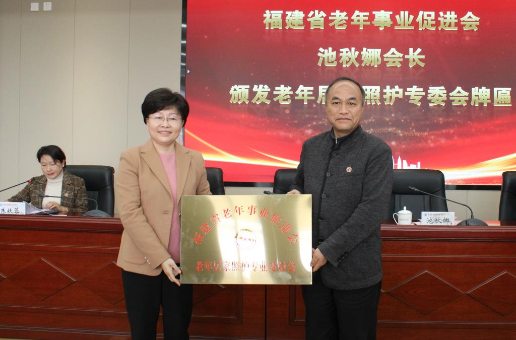 何晓清宣读了老年居家照护专业委员会成立的通知。池秋娜向专委会主任委员单位授牌,许能锋代表学校接受专委会牌匾。