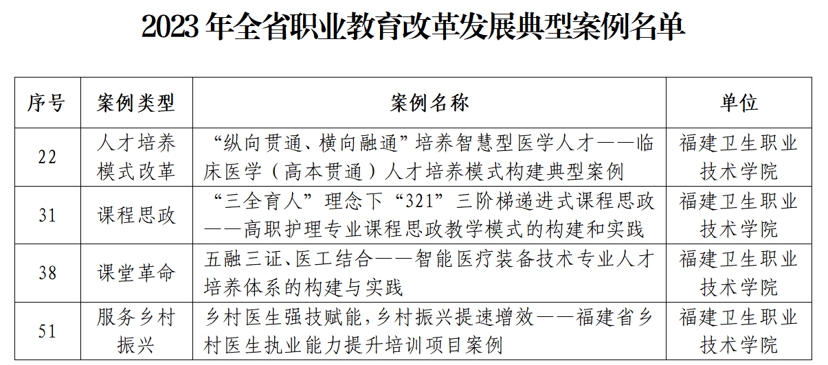 近日,福建省职业技术教育中心公布2023年全省职业教育改革发展典型案例名单,我校报送的《“纵向贯通、横向融通”培养智慧型医学人才——临床医学(高本贯通)人才培养模式构建典型案例》(医学院)、《“三全育人”理念下“321”三阶梯递进式课程思政——高职护理专业课程思政教学模式的构建和实践》(护理学院)、《五融三证、医工结合——智能医疗装备技术专业人才培养体系的构建与实践》(医学技术系)、《乡村医生强技赋能,乡村振兴提速增效——福建省乡村医生执业能力提升培训项目案例》(继续教育学院)四个案例分别入选“人才培养模式改革”“课程思政”“课堂革命”“服务乡村振兴”类型典型案例。