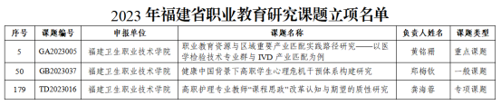 近日,福建省职业技术教育中心公布了2023年福建省职业教育研究课题立项结果,我校三项课题喜获立项。其中,黄铭珊副教授主持的《职业教育资源与区域重要产业匹配实践路径研究——以医学检验技术专业群与IVD产业匹配为例》和郑梅钦老师主持的《健康中国背景下高职学生心理危机干预体系构建研究》两项课题获批“职业教育教学改革研究常规课题”立项,龚海蓉教授主持的《高职护理专业教师“课程思政”改革认知与期望的质性研究》获批“职业教育教师教学创新团队专项课题”立项。