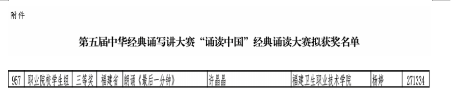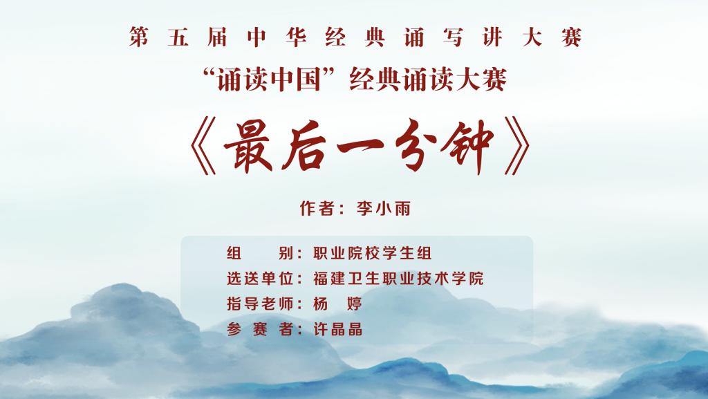 近日,由教育部、国家语委主办的“第五届中华经典诵写讲大赛”经典诵读赛项结果揭晓,在人文教学部杨婷老师的指导下,我校药学院2021级学生许晶晶深情演绎的经典作品《最后一分钟》,以青年学子的视角诠释经典、致敬经典,荣获国赛三等奖。