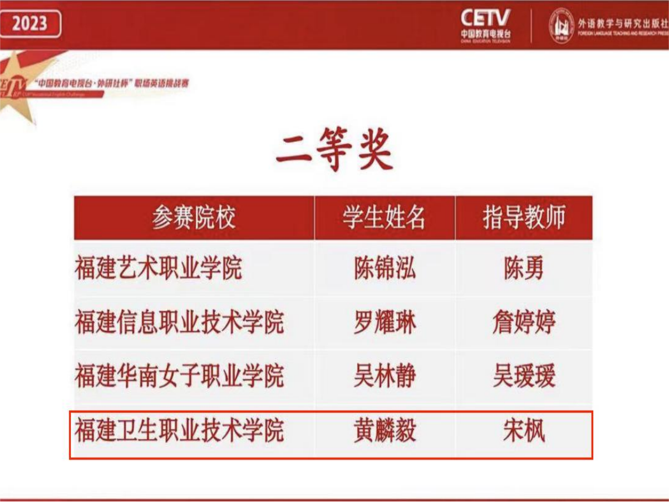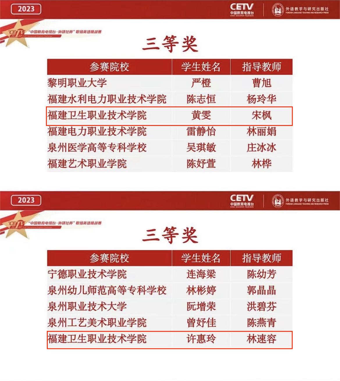 近日,2023“中国教育电视台·外研社杯”职场英语挑战赛福建赛区演讲、写作大赛顺利举办。我校人文教学部宋枫老师指导的2021级医学影像技术301班黄麟毅同学荣获演讲赛项二等奖,2021级医学影像技术302班黄雯获写作赛项三等奖;林速容老师指导的2021级医学影像技术501班许惠玲获写作赛项三等奖。