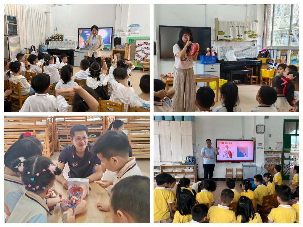 活动伊始,支部党员教师在校健康科普青年讲团成员的协作下,从专业知识角度出发,针对小班、中班、大班小朋友的年龄特点和理解程度,现场分班进行绘本共读、模型拼装、模拟体验、急救知识宣教等内容丰富的健康科普活动。