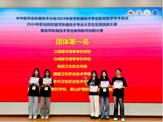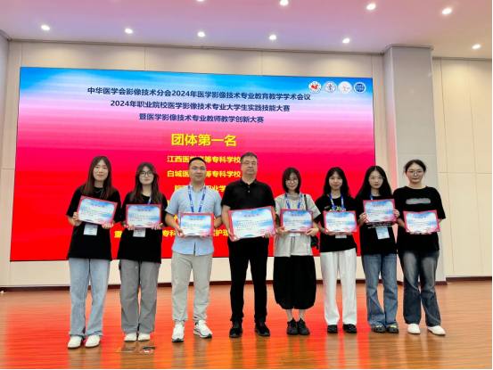 9月19日至22日,2024年职业院校医学影像技术专业大学生实践技能大赛在江西上饶举行,我校医学技术与工程学院医学影像技术专业获得团体一等奖,并获单项一等奖三项、三等奖两项的好成绩,杜世远、曾良成和吴沁三位老师获得“优秀指导教师”荣誉称号。