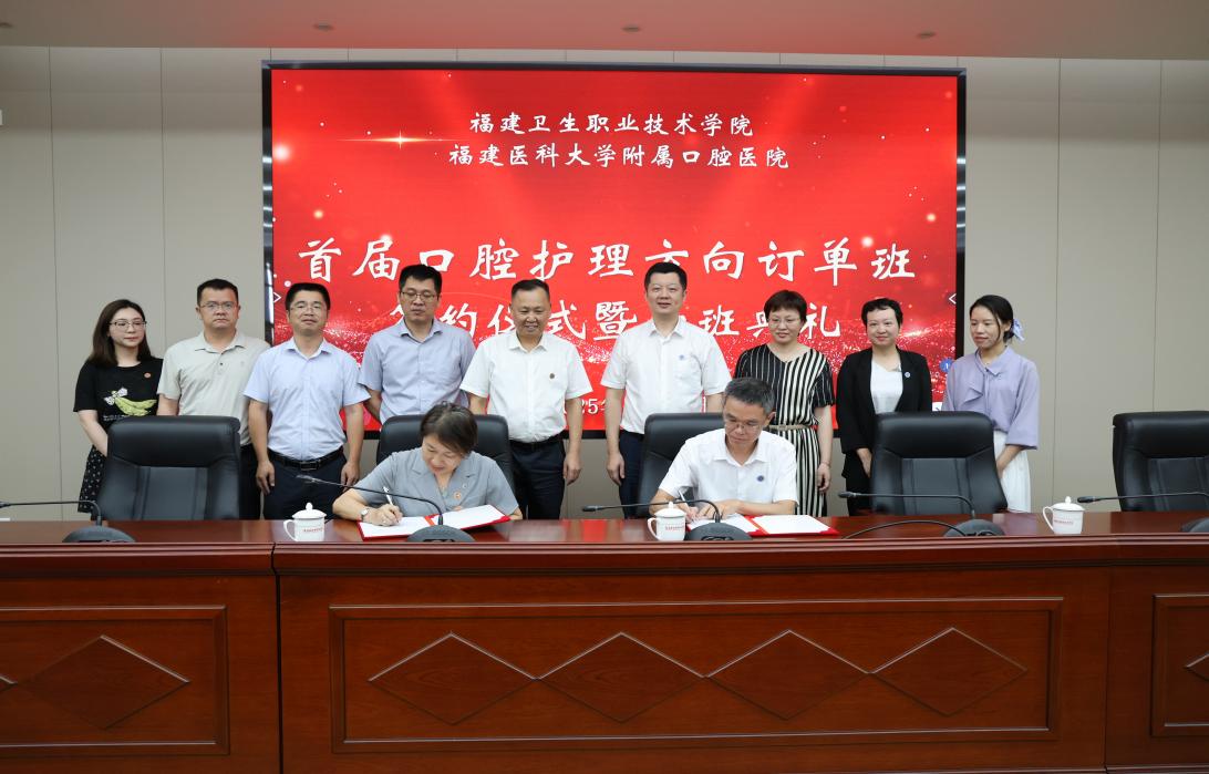 6月17日,我校与福建医科大学附属口腔医院口腔护理方向订单班签约仪式暨开班典礼在厚德楼六楼会议室举行。福建医科大学附属口腔医院党委副书记张尉(主持工作)、副院长骆凯、护理部负责人危艳萍、护士长谢畅畅,学校党委书记曾武祈、副校长朱扶蓉,教务处、护理学院、医学院相关人员以及21名口腔护理方向订单班学生共同参加开班仪式。