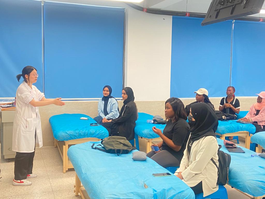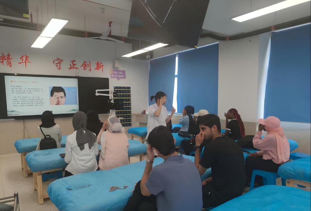 近日,福建医科大学海外教育学院14名预科班外籍学生走进我校“皇甫谧针灸推拿学堂”,开启中医药文化沉浸式研学。此次活动以头面部腧穴的临床应用为主题,通过理论教学与实践操作相结合,系统展现中医经络学说的独特魅力。