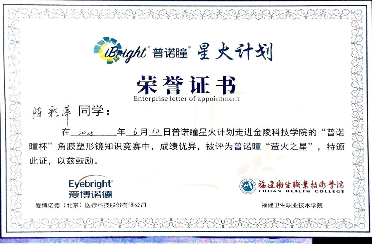 此外,培训还举办了一场“普诺瞳183星火计划知识竞赛”。竞赛题目涵盖角膜接触镜与角膜塑形镜的诸多知识点,旨在检验同学们的学习成果。经过激烈的角逐,毛思丹、陈彩萍、吴华真三位同学凭借扎实的专业知识储备与出色的现场发挥,分别荣获竞赛的前三名。这场知识竞赛不仅激发了学生的学习热情与竞争意识,更为校企双方提供了一个直观了解学生学习成效的平台,以便后续针对性地优化教学内容与培训方式。