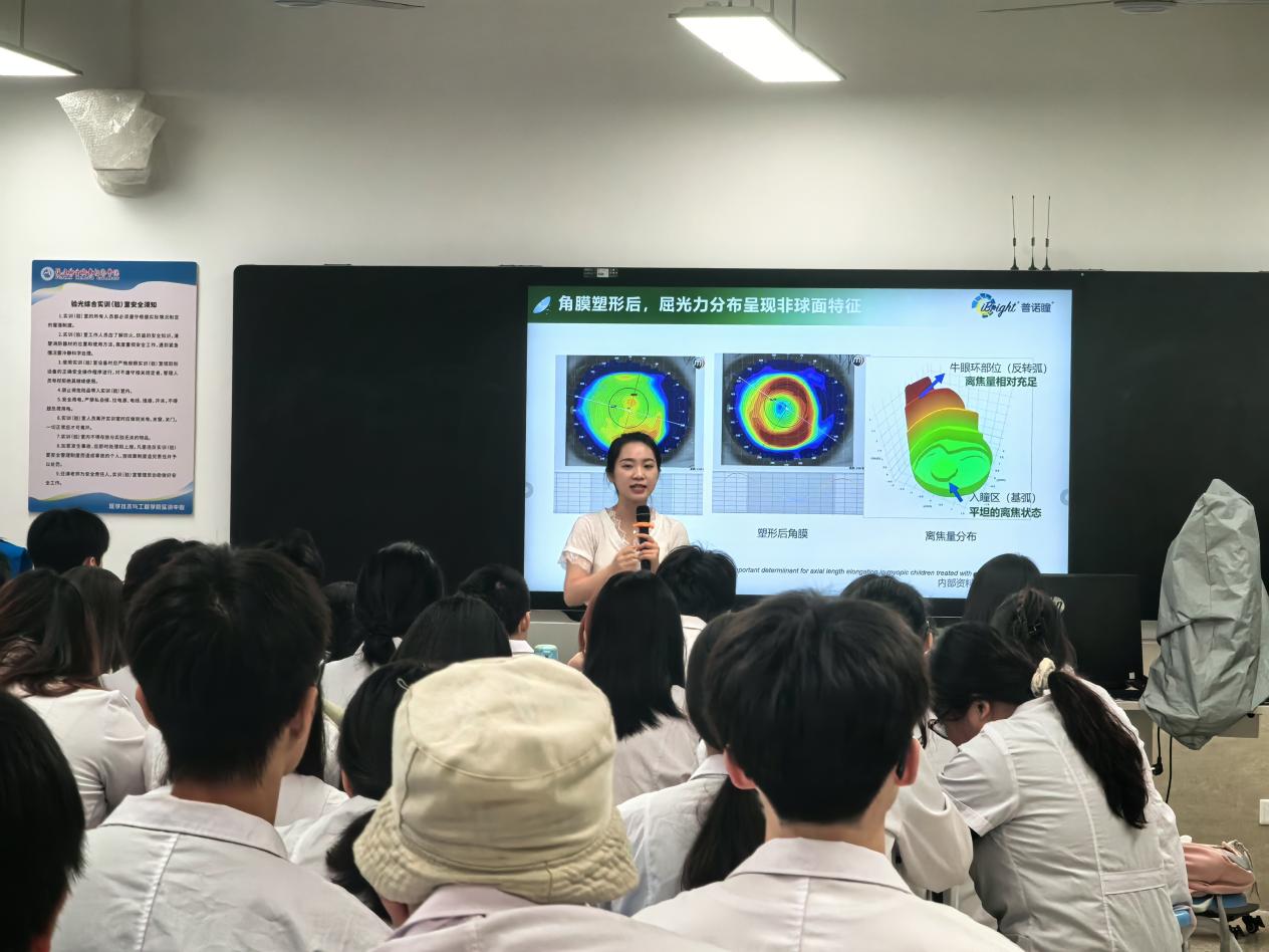 普诺瞳公司的专业讲师以其丰富的行业经验与扎实的专业素养,为同学们深入浅出地讲解角膜塑形镜的种类、材质、设计原理以及适配要点等理论知识。课堂上,同学们全神贯注、踊跃提问,积极与讲师互动,现场气氛热烈。这些理论知识为同学们后续的实践操作以及未来的职业发展筑牢根基,也让学生对眼视光行业的前沿技术与规范流程有了更加清晰的认知。
