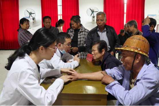 在结对共建座谈会的同时,我系党总支志愿服务队的师生为梧桐下村村民开展健康义诊活动,中医诊疗、测量血压、中医拔罐、皮肤问题咨询与检测、红十字急救技能培训等惠及当地村民的健康服务项目深受村民欢迎。志愿者通过宣讲,将健康知识、健康理念传递给村民。