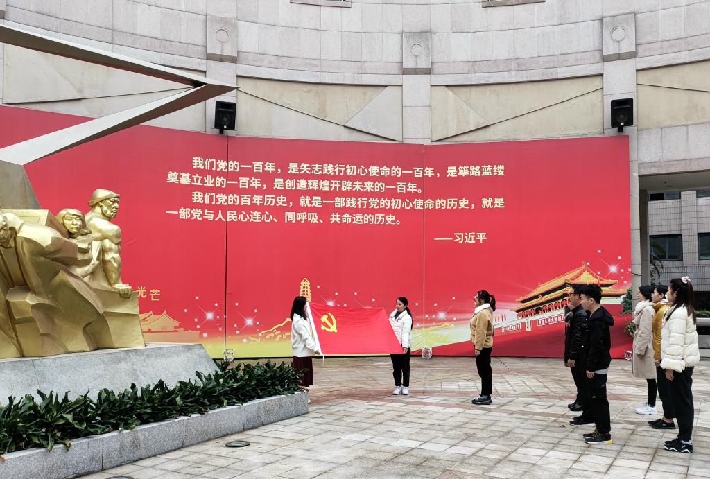 参观结束后,在革命纪念馆雕像《奋斗》旁,支部书记邹艳辉带领同志们面向着鲜艳的党旗庄严宣誓,重温入党誓词。入党誓词,是党员对党和人民作出的庄严承诺,也是党员必须遵守的行为准则。在革命历史纪念馆参观学习后重温入党誓词,更能促进党员同志们牢记入党初心,坚定理性信念,强化党性修养。