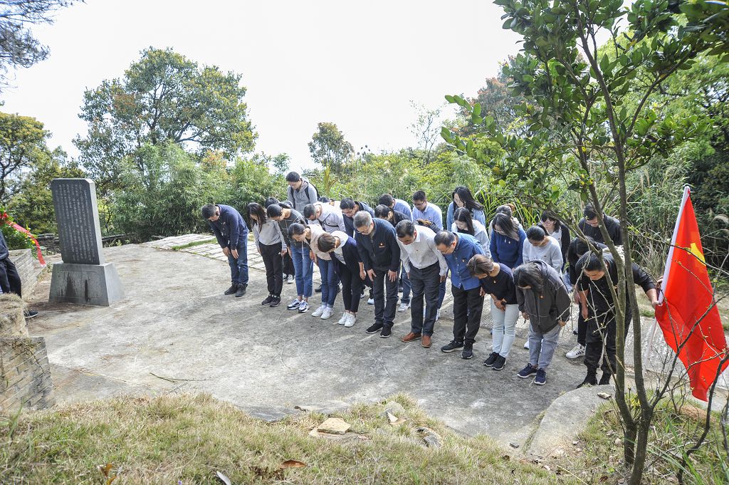 伴随着旭日的光辉,药学院第二党支部与福建省医药有限责任公司党总支的党员们抵达降虎寨。踏过青苔斑驳的层层石阶,长眠着600多名红军英魂的烈士墓静驻于松林之中。