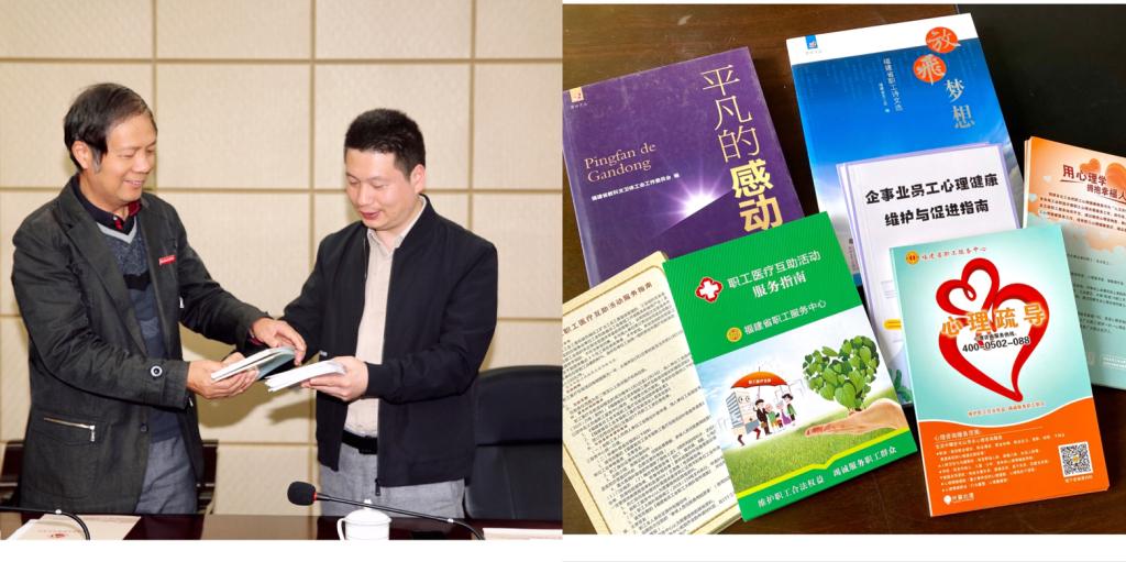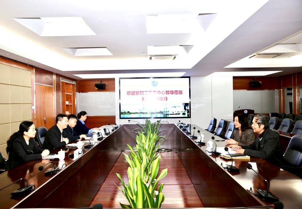 江云向我校赠送了《职工医疗互助活动服务指南》《企事业员工心理健康维护与促进指南》等学习宣传资料,希望我校发挥医学院校专业特色优势,与省职工服务中心联合面向社会开展职工心理健康服务工作。