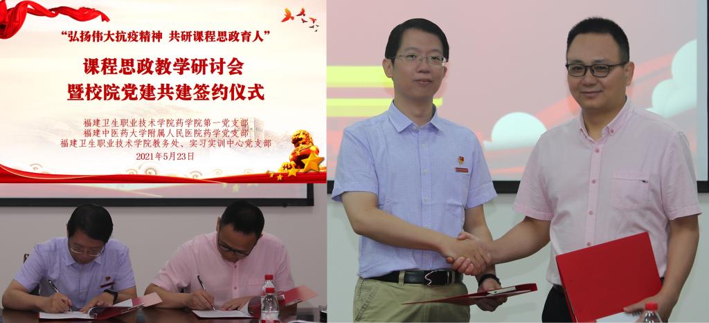 活动伊始,药学院第一党支部书记何舒澜与福建中医药大学附属人民医院药学党支部书记江川共同签署结对共建协议书,在与会党员的见证下郑重承诺:将从抗疫精神中共同凝练优秀精神基因,共研课程思政、共探思政元素、共建思政资源、共育思政能力、共评思政成效,以生为本,共商共议,校院互补,优势叠加,探索构建“校院思政育人共同体”,共同打造课程思政示范项目。