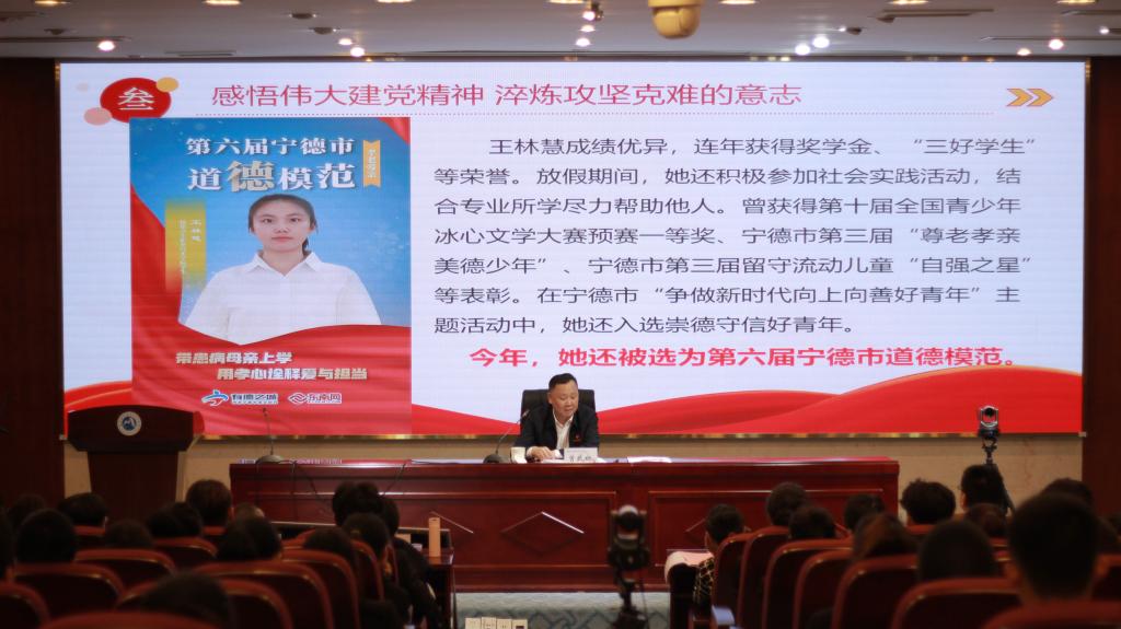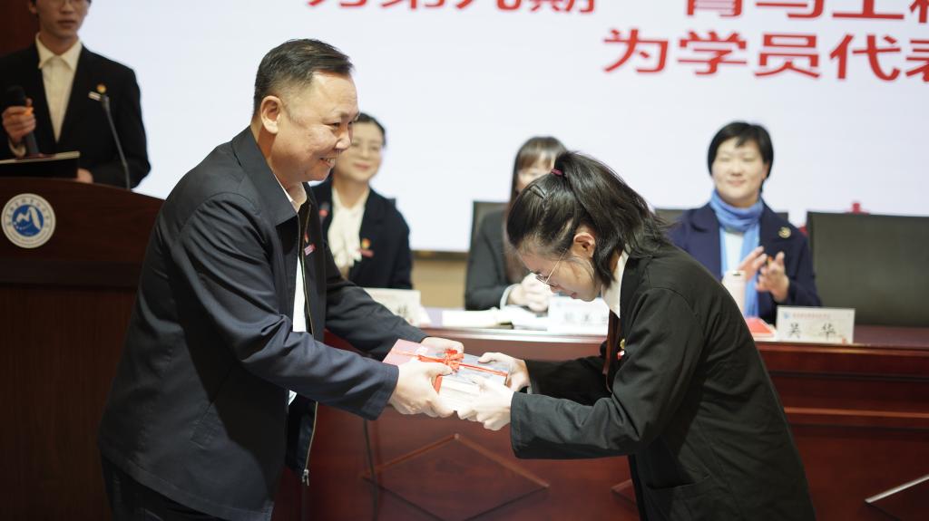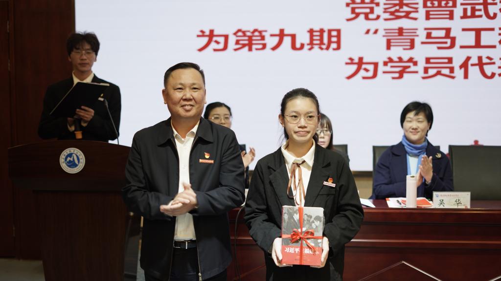 曾武祈为第九期“青马工程”培训班授旗并赠予学生代表《习近平在福建》系列书籍,勉励青马学员从习近平总书记在闽工作的点点滴滴中磨砺自我,笃定共产主义信仰。