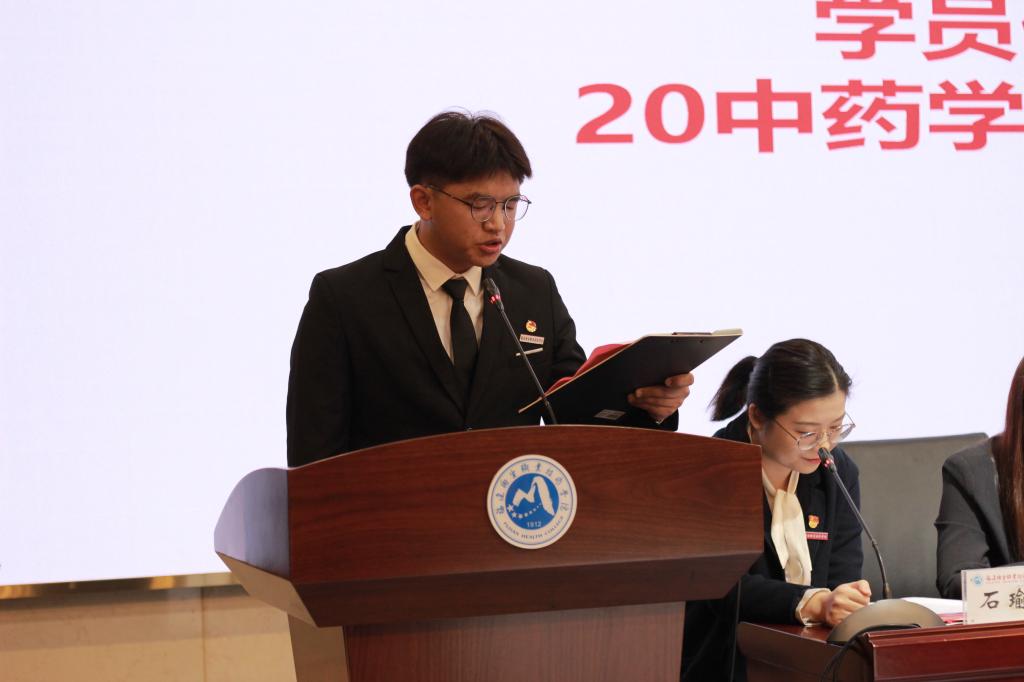 20中药学302班李忠绪同学作为第九期青马班学生代表庄严承诺:要时刻以青年马克思主义者的标准来衡量自己,要认真学习和领会党的创新理论。