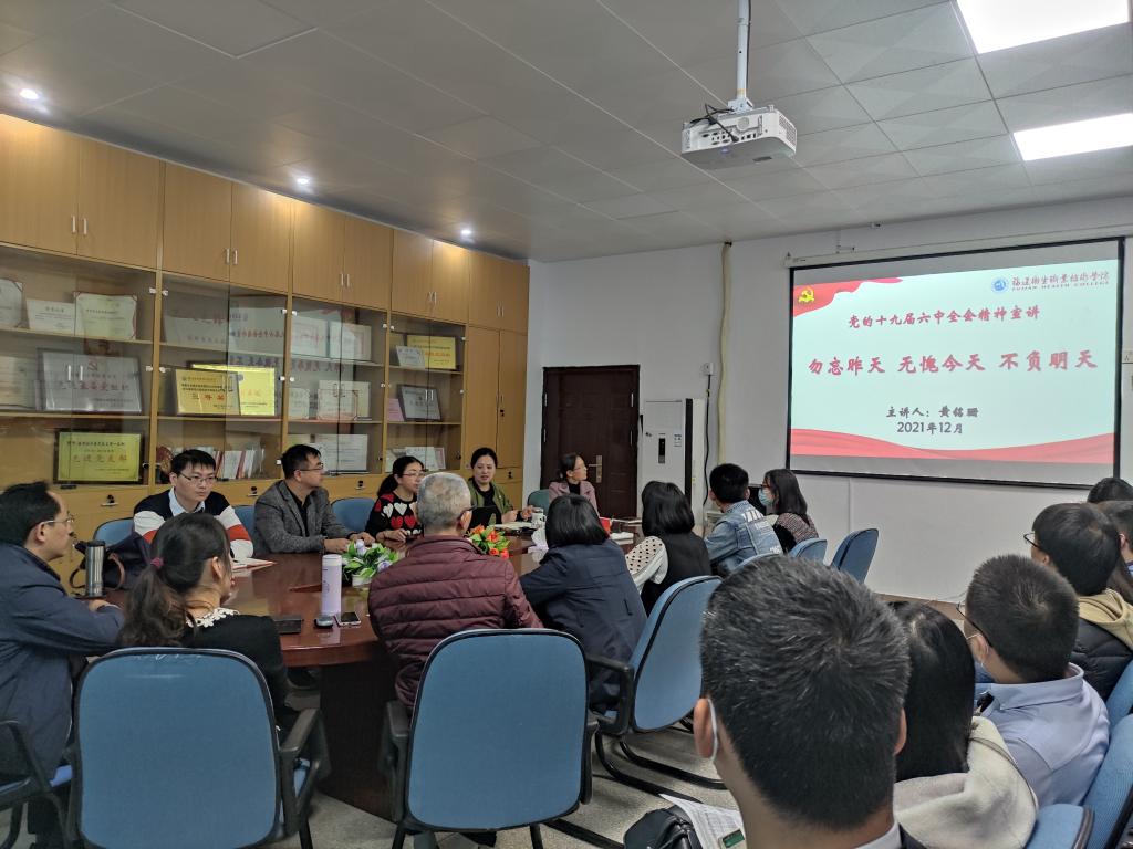 12月16日,副校长黄铭珊为医学技术系党员宣讲党的十九届六中全会精神。