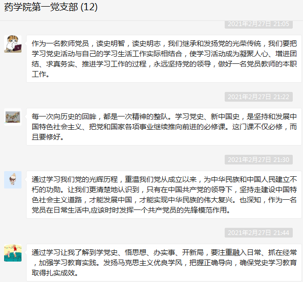 为深入贯彻习近平总书记在党史学习教育动员大会上的重要讲话精神,引导支部党员学史明理、学史增信、学史崇德、学史力行,2021年2月27日,药学院第一党支部在线上开展“学党史、守初心、强党性、担使命”主题党日活动,活动由支部书记何舒澜主持。