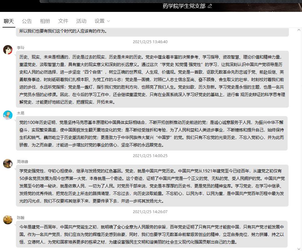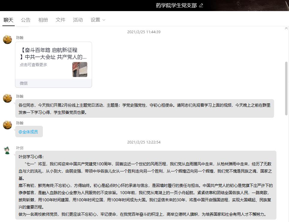 2月25日,药学院学生党支部组织开展“学党史强党性、守初心担使命”主题党日活动,支部党员集体观看“奋斗百年路 启航新征程”短视频,支部书记陈翰主持活动。