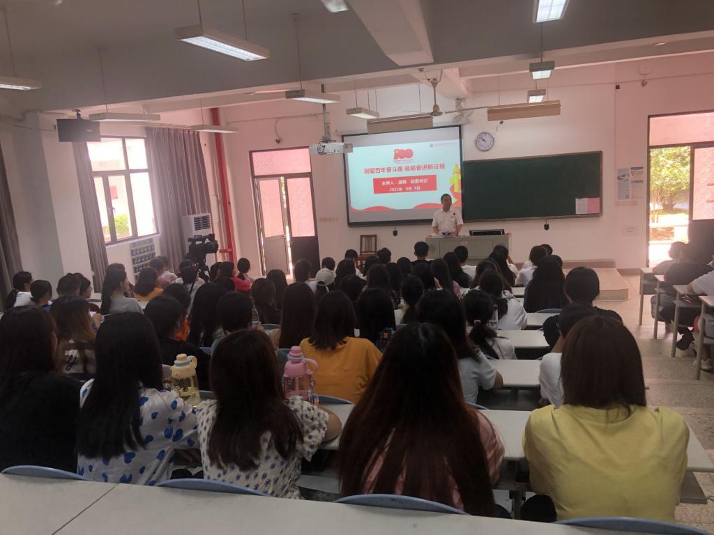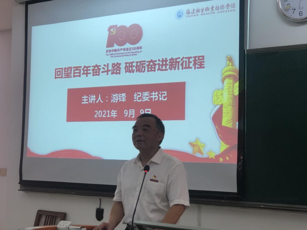 游锋从回望:丰功伟绩 恢宏史诗;赓续:精神血脉 代代相传;借鉴:以史为鉴 开创未来三个方面讲述了过去一百年中国共产党团结带领中国人民为实现中华民族伟大复兴进行的一切奋斗、一切牺牲、一切创造,以及在百年新起点的中国共产党正团结带领中国人民以不可阻挡的步伐迈向伟大复兴。游锋还带领大家回顾了我校为创建“特色鲜明,省内一流,国内领先”的高水平医药卫生类高职院校做出的努力,并向同学们展示了学校新一轮发展的设想与蓝图。最后他希望同学们作为实现中华民族伟大复兴的先锋力量,要以实现中华民族伟大复兴为己任,弘扬“敬佑生命、救死扶伤、甘于奉献、大爱无疆”的医者精神,勤勉奋进,勇于担当,不负党和人民的殷切期望!