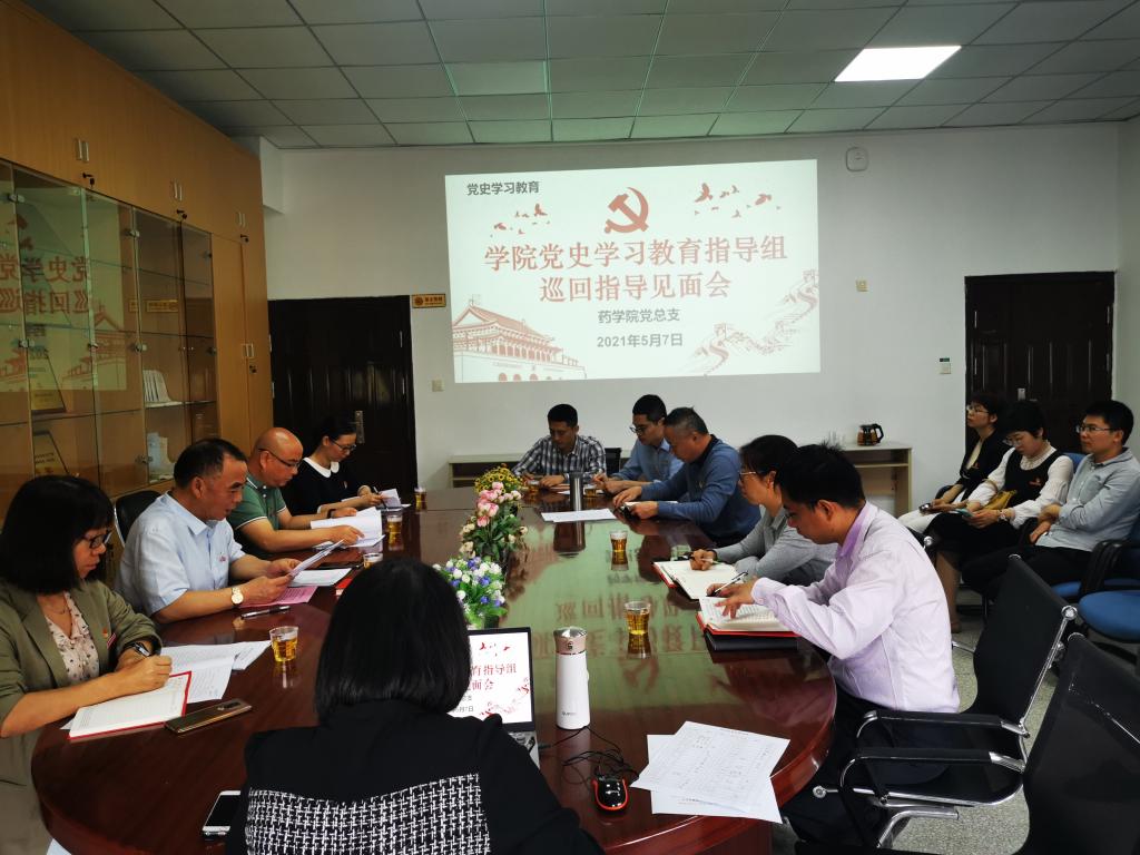 2021年5月7日,药学院党总支在会议室召开校党史学习教育指导组见面会。第三指导组组长、纪委书记游锋,指导组成员医学系党总支书记邱滚忠、党委组织统战部张云霞、医学系辅导员陈恩平莅临现场指导。药学院党总支领导班子成员、全体教职工党员参加大会。