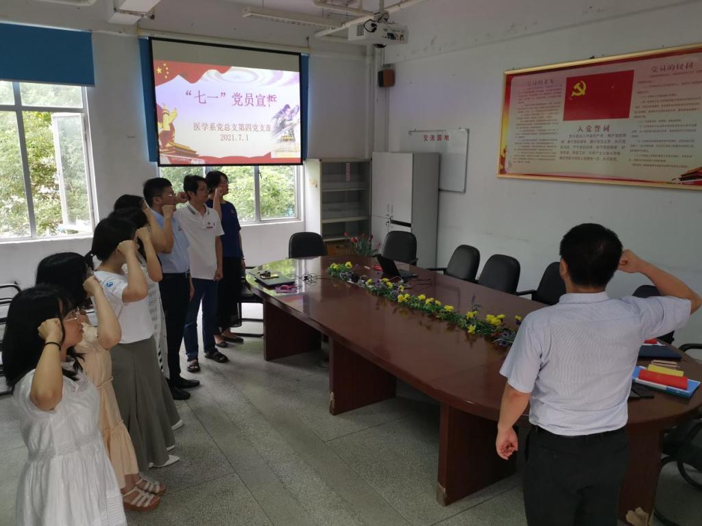 2021年7月1日,医学系第四党支部全体党员齐聚医学基础部会议室,开展庆祝中国共产党成立100周年主题党日活动。