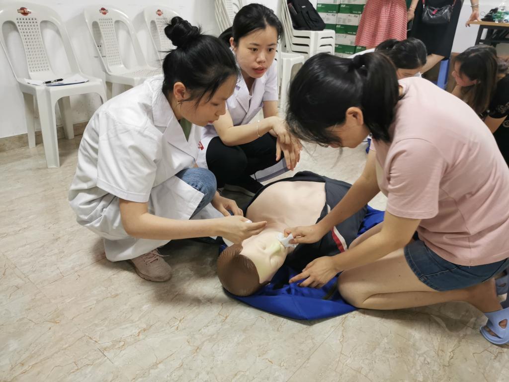 医学系中医教研室教师王雯婷、叶汝萍首先为现场几十名社区工作人员、物业人员讲解了现场救护原则、“徒手心肺复苏”的操作要点并示范动作要领,并利用模拟人现场演示“心肺复苏”操作流程。随后,大家组织社区工作人员和物业人员进行实际演练,现场给予操作的正确指导,并共同解答了大家提出的相关问题,现场学习气氛活跃。