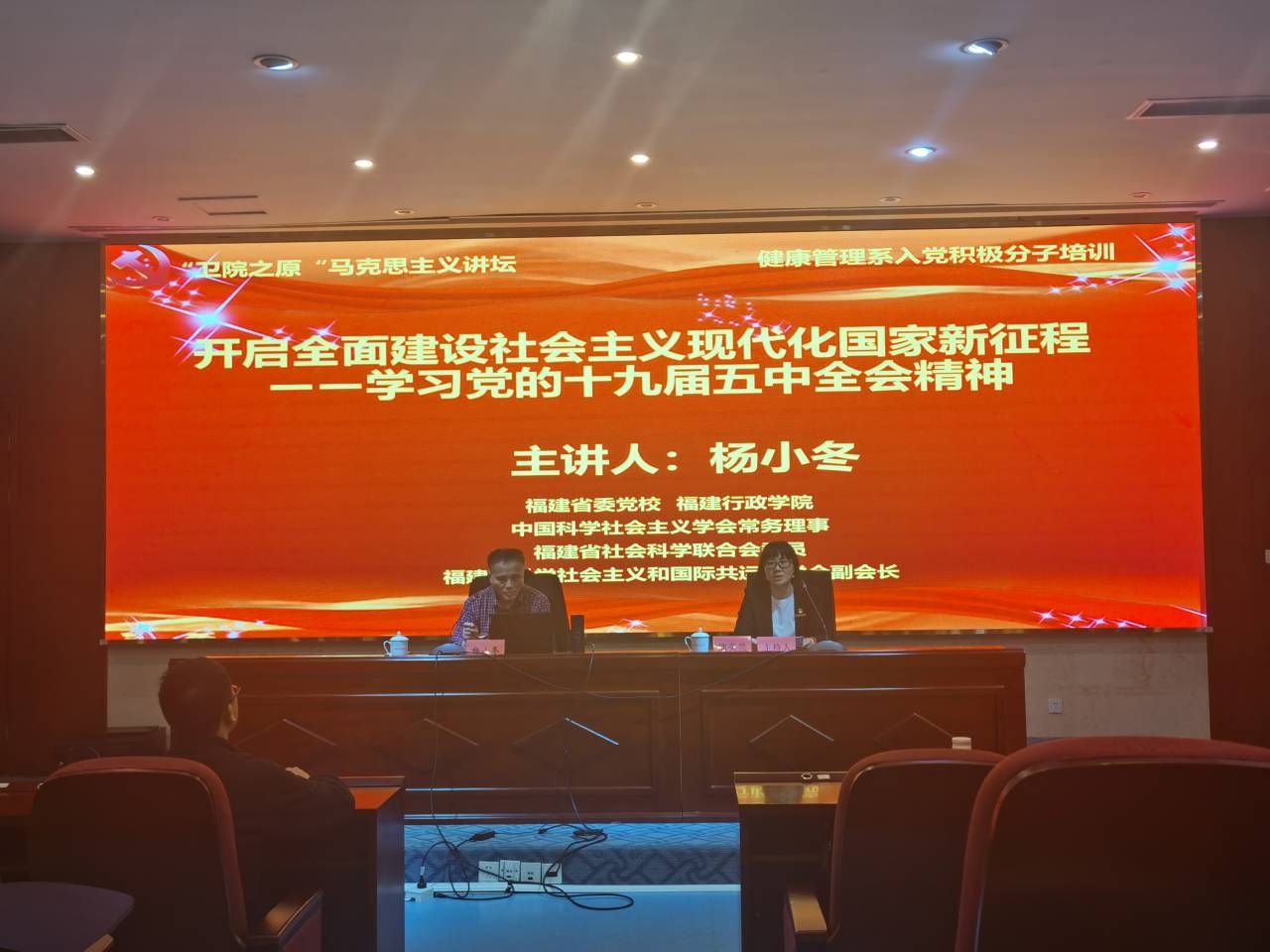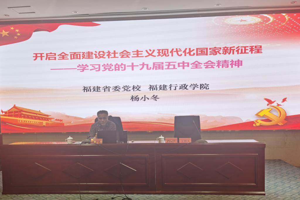为深入学习领会习近平新时代中国特色社会主义思想和党的十九届五中全会精神,深刻认识我国当前社会发展新阶段新特征,增强“四个意识”、坚定“四个自信”、做到“两个维护”,2021年3月19日,福建省委党校、福建行政学院杨小冬教授应邀为我校马克思主义讲坛开设《开启全面建设社会主义现代化国家新征程——学习党的十九届五中全会精神》的专题讲座。讲座由马克思主义学院院长熊美兰主持,马院全体思政课教师和健康管理系入党积极分子参加了讲座。