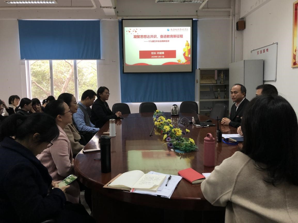 许能锋用1234569的数字方式,解读了党的十九届五中全会精神中的一个主题、两件大事、三个新的逻辑主线、四个全面战略升级、五个坚持基本原则、六个新目标和九个远景目标。同时还回顾了我校“十三五”时期教育发展取得的显著成就,并对学校“十四五”规划的总体目标、建设思路进行了展望。