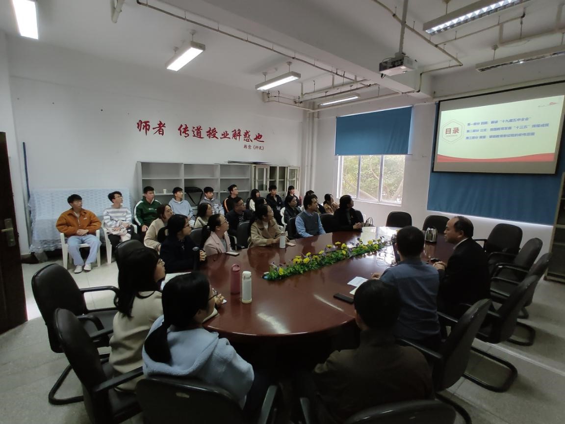 12月11日,校领导许能锋院长在医学基础部会议室作学习贯彻党的十九届五中全会精神宣讲报告。报告会由医学基础部副主任邓元荣主持。医学基础部教职工、2020级口腔301班学生代表参加报告会。