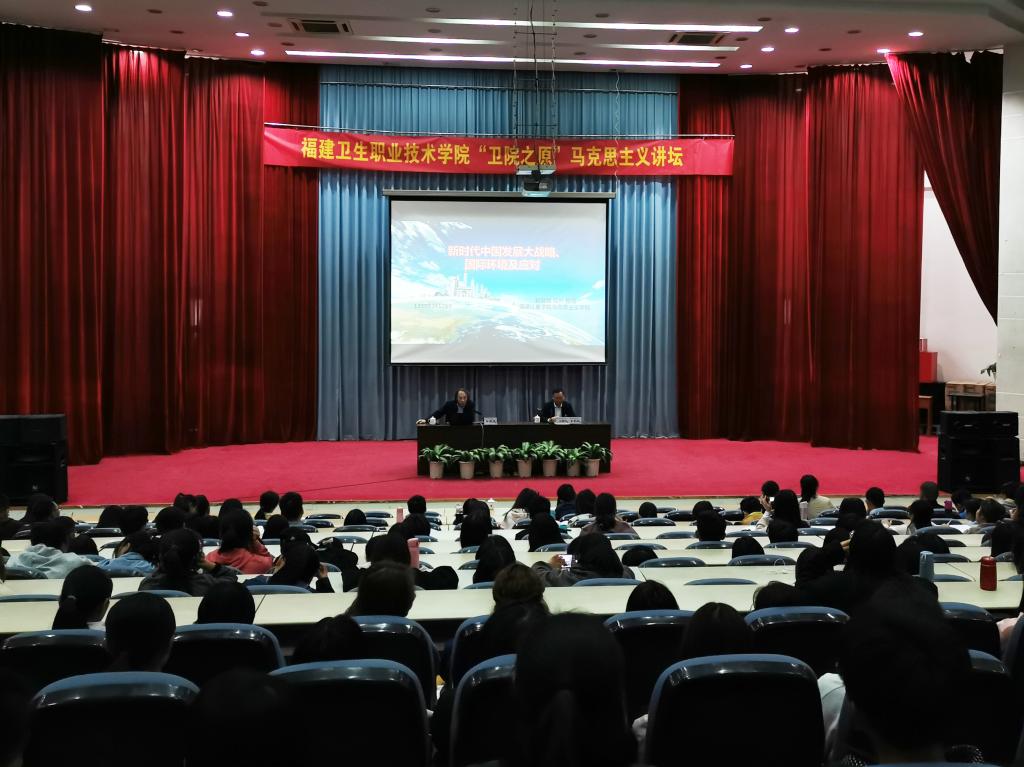 为深入开展“不忘初心、牢记使命”主题教育,增强我校师生的初心使命意识和勇于担当作为的历史责任感、使命感和紧迫感,11月28日下午,我校“卫院之原”马克思主义论坛在学术报告厅举行。本次论坛邀请福建江夏学院马克思主义学院院长郭健彪教授为我校师生“新时代中国的发展大战略及当下面对的国际环境”专题讲座。讲座由校党委书记曾武祈主持,校党委副书记李美华、各系部、学工处和团委中层干部、全体辅导员、马院全体教师、护理系学生代表、管理系学生代表及社团学生代表参加了此次活动。