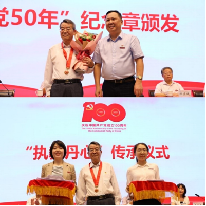 6月24日下午,学校召开庆祝中国共产党成立100周年暨“两优一先”表彰大会,校党委书记曾武祈为老党员代表颁发了“光荣在党50年”纪念章和鲜花,并举行了新、老教师党员“执教丹心”的传承仪式。纪念章颁发仪式庄重而简朴,光辉的纪念章代表着以习近平同志为核心的党中央对老党员教师们的关怀和温暖,映照着老党员教师为教育事业坚守的不变初心。