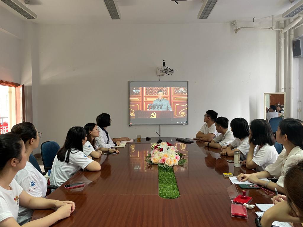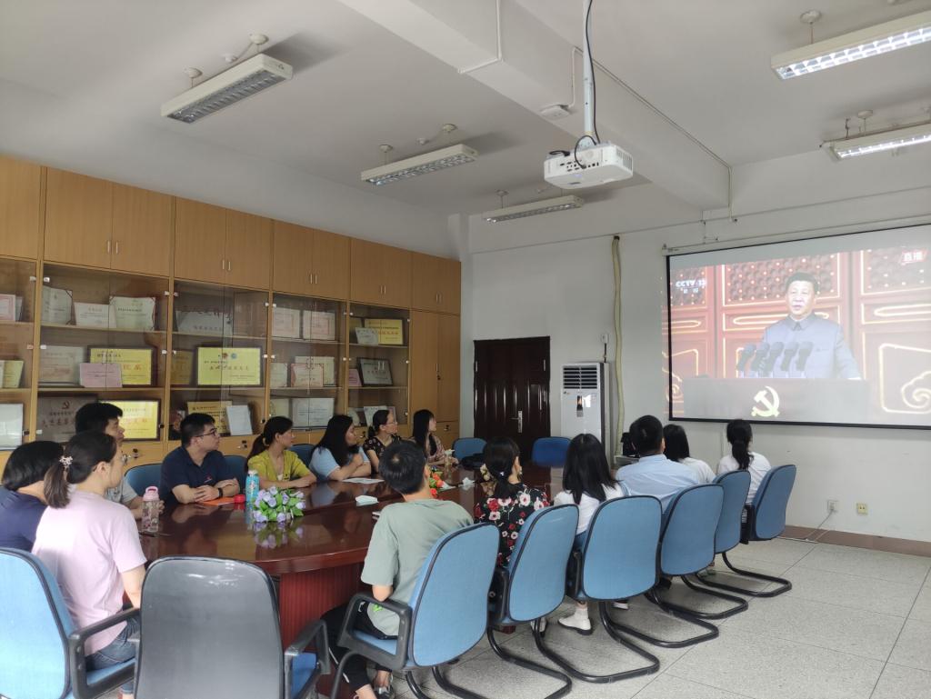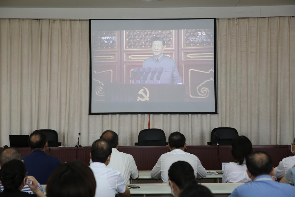校领导班子成员、各党总支(直属党支部)书记、各二级院(系、部)主任(含主持工作副主任)、机关党总支全体党员、机关各处室非党员的副科级及以上干部等100余人在行政楼六楼会议室集体收看庆祝中国共产党成立100周年大会直播。各二级院(系、部)、离退休党总支分别组织师生观看庆祝大会直播。