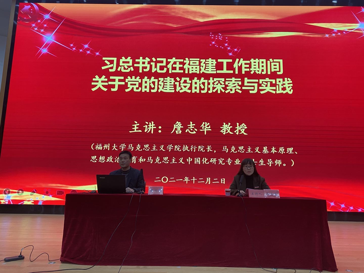 为进一步深入学习领会习近平新时代中国特色社会主义思想,特别是习近平总书记关于党的建设重要论述,2021年12月2日,福州大学马克思主义学院执行院长、博士詹志华教授受邀在学术报告厅作题为《习近平总书记在福建工作期间关于党的建设的探索与实践》的专题讲座。讲座由马克思主义学院院长熊美兰主持,马克思主义学院全体教师及医学系师生代表近300人参加。
