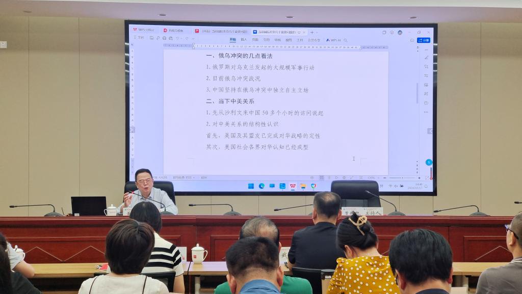 为深入贯彻落实党的二十届三中全会精神,引导我校师生观察形势、认识形势、掌握形势,树牢总体国家安全观,10月17日,我校邀请福建省中华职教社党组原书记黄子曦在厚德楼六楼会议室开展《当前国际形势几个重要问题的看法》专题讲座。讲座由校党委书记曾武祈主持,校领导、副处级以上领导干部,马克思主义学院全体教师、学生代表参加。