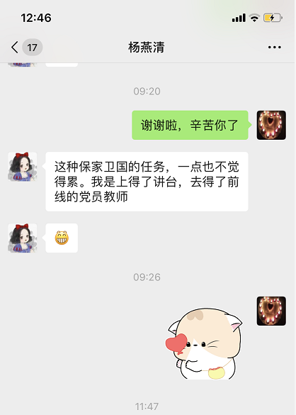 一个党员就是一面旗帜。为更好的完成使命,党员师生克服困难,走到了培训的第一线。“看到昔日里总是在讲台上教授我们的老师,像个学生一样,一遍一遍的向一线医生询问细节,一次一次的反复训练穿脱防护服,那样子真的很感人,也很激励我们。”学生邓显兰说,“那个时候,我突然忆起了我们的校训‘业精德诚’。我感谢我有这样的老师,感谢她们教给我的一切。” “这种保家卫国的任务,一点也不觉得累,我是上得了讲台,去得了前线的党员教师。”这是青年党员教师杨燕清给党组织的回复,没有华丽的语言,有的是一名党员教师的坚定与朴实。