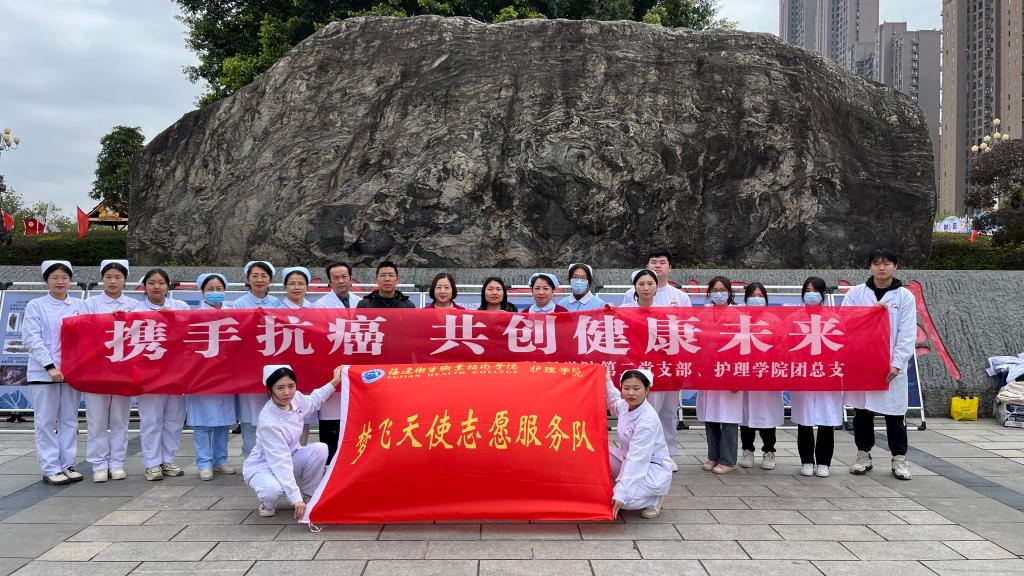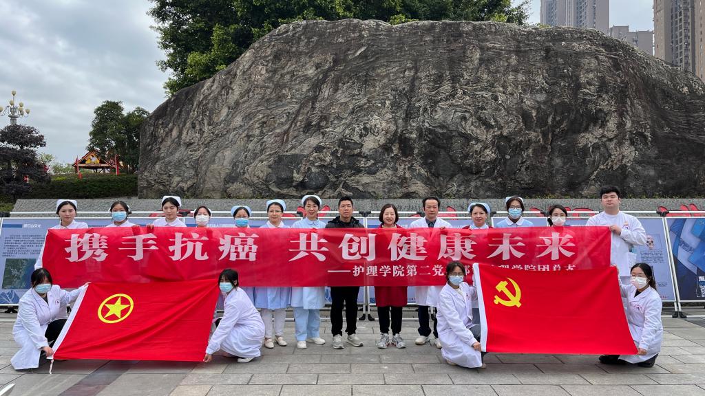 在活动现场,护理学院第二党支部带领师生向现场居民发放抗癌防癌健康宣传知识手册,为居民们宣讲肺癌、食管癌、乳腺癌等常见癌症防治的科学知识和预防措施,并针对这些常见癌症的病因、症状和早期发现方法进行具体分析,鼓励带病居民乐观积极面对疾病。