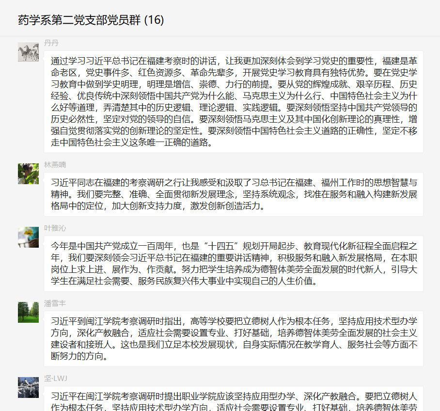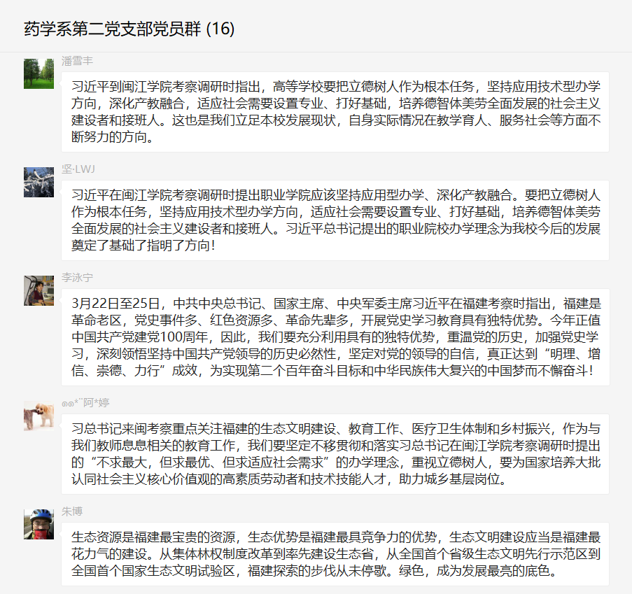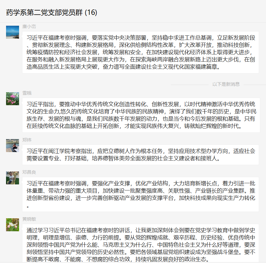为学习贯彻习近平总书记在福建考察调研时的重要讲话精神,药学院第二党支部于2021年3月30日开展线上专题学习。本次专题学习由支部书记刘丹丹同志主持。