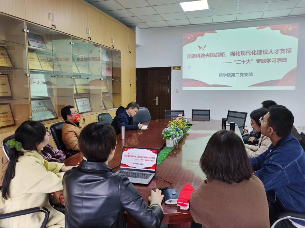 为进一步学习宣传贯彻好党的二十大精神,2023年1月5日,药学院第二党支部书记围绕“实施科教兴国战略,强化现代化建设人才支撑”开展主题党日专题学习。本次活动由支部书记刘丹丹主持。