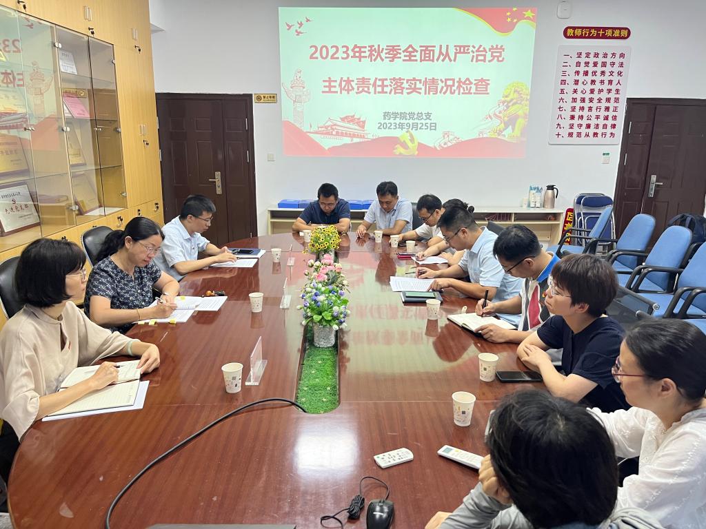 2023年9月25日,药学院党总支在会议室召开2023年秋季全面从严治党主体责任落实情况检查会。学校主题教育协调推进四组组长、副校长黄铭珊,组员护理学院党总支副书记林来元、护理学院党总支专职组织员许慧琼到会指导,药学院党政领导班子成员、总支支委、各支部书记参加本次会议。