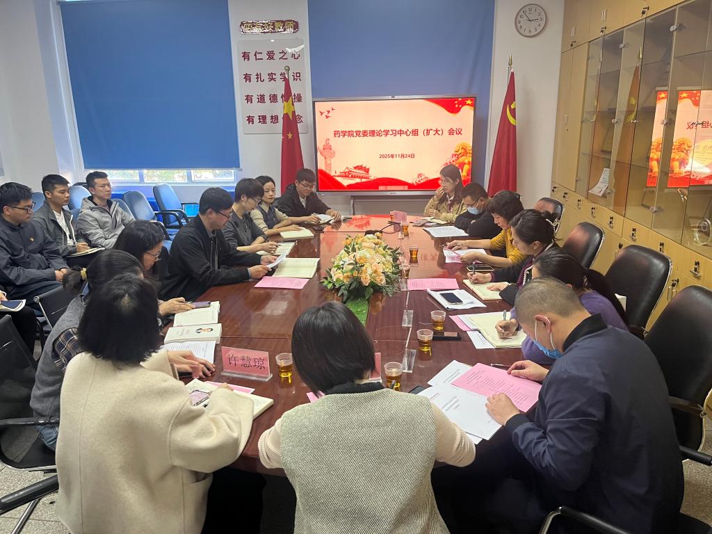 2025年11月24日,药学院召开党委理论学习中心组(扩大)会议,校党委委员、党委副书记李美华率第三检查组莅会旁听指导。学院党委领导班子成员、全体党务干部参加会议。