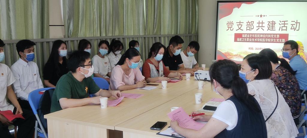 为进一步加强对学生预备党员的党性教育,树立入党初心,9月16日,医学院学生党支部与党建共建单位福建省老年医院神经内科党支部开展共建活动。老年医院党办主任、神经内科党支部党员、医学院专职组织员、第二、第五学生党支部党员以及9名学生预备党员参加了此次活动。