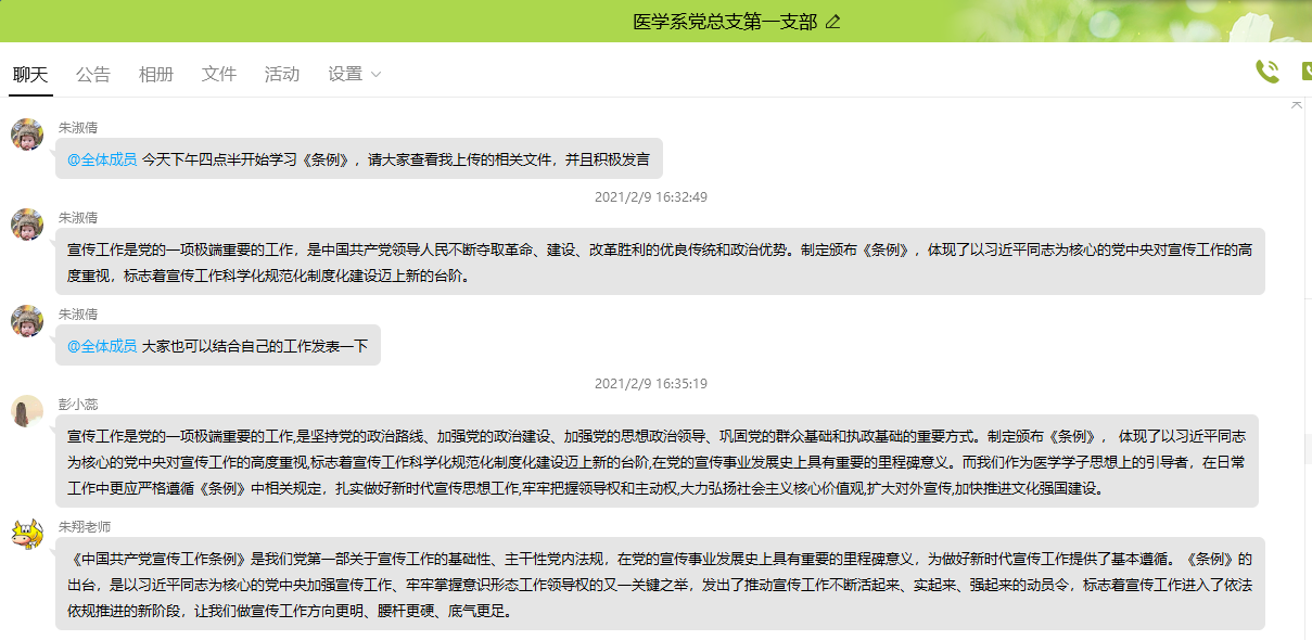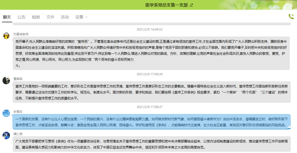 此次党日活动,通过线上学习、交流讨论等形式开展。首先,朱翔书记认真传达了《条例》出台的意义、主要框架,《条例》关于宣传工作的定位、作用、指导思想和根本任务,各级党委承担宣传工作职责的规定以及对加强基层宣传工作出实招。